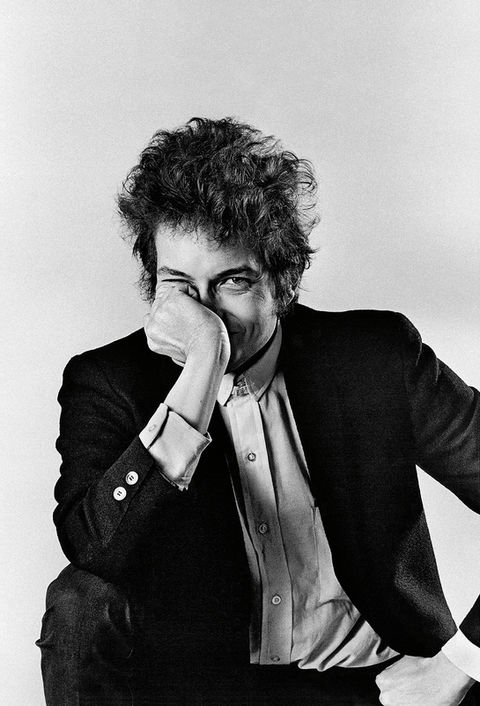 This is one of the shots I’ve been sitting on for 50 years. It has never been seen before. I wanted the shot to express the fact that Bob Dylan was about to change. He’s not the guy in the leather jacket any more. Now, he’s the guy in the dark sport blazer wearing nice cufflinks. There’s no guitar in the shot because I saw him not as any one kind of performer but as a prince of music. I had been in the sessions for the album, so I knew now who he was musically. The photo was shot in Albert Grossman’s house. The room was the original kitchen of this house that’s a couple hundred years old. The fireplace is big enough to cook in. The divan, which was multicolored, was a gift from Mary Travers, of Peter Paul and Mary, to Albert and his wife, Sally, for their wedding. Bob contributed to the picture the magazines he was reading and albums he was listening to. Bob wanted Sally to be in the photo because, well, look at her! She chose the red outfit.